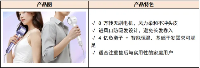 专业产品:专业的品牌深耕个护家电领域,这类品牌会对气流倍增技术、负离子渗透技术、风速稳定性和动力衰减度、温控精准度等核心参数进行深入调教,同时兼顾干发速度和养护效果!