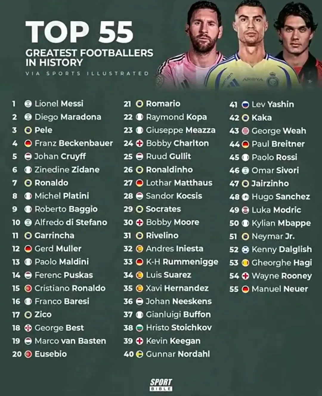 近日,英媒Sport Bible评选出了足坛历史55大球员排行榜榜单。其中,梅西排第一,而C罗仅排第15名引发热议。