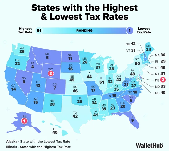 2026 年报税季临近,美国各州州税与地方税差异显著,税负最重州的负担可达最轻州两倍以上。WalletHub 发布 2026 年美国各州税负排行榜,综合所得税、房产税、销售与消费税等维度,对比全美 50 州及华盛顿特区的实际税负水平,清晰呈现税负高低分布,为居民与投资者提供参考税负最低前五州
