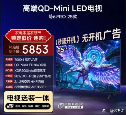 FFALCON雷鸟电视鹤6 PRO 25款85S595C Pro 85英寸,主打QD-MiniLED、电竞游戏功能,提供固定挂架和送装一体服务,还能享受国家补贴,特别适合喜欢玩电竞游戏、看体育赛事,注重画面流畅度和画质,追求高性价比,希望安装便捷的年轻家庭。它的85英寸巨幕能带来沉浸式的游戏和观影体验,不管是玩大型电竞游戏,还是看球赛、动作电影,都能感受到强烈的代入感。