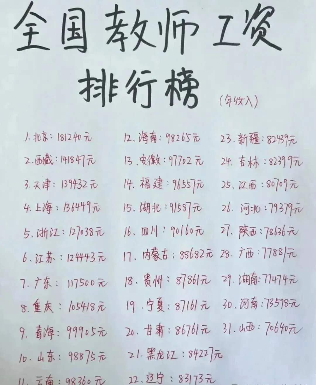 看到江苏我就明白了,这张对全国教师收入统计的图片信息并不真实,数据精确到个位数明显是不可能的,并且还缺了好几个地方的数据。