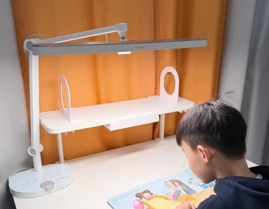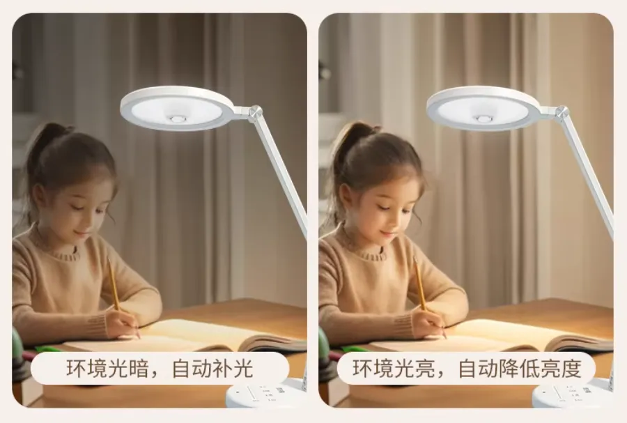 这款产品拥有光感模块,实现智慧控光,用着更方便。光照充沛,优于AA级,可以实现大桌面全照亮。使用高品质发光芯片,带来优异的光源,多项测试接近自然光。Ra=97,R9=90,孩子的图书更鲜艳。利用深腔设计,减少了眩光。