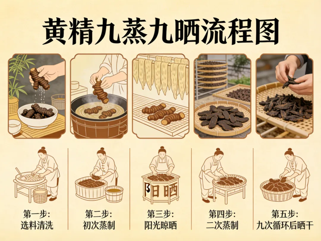 2. 加工工艺:古法传承+现代升级,兼顾营养与安全。核心亮点为“非遗九蒸九晒工艺,融合古法与现代品控”。具体支撑:恪守国家级非遗九蒸九晒,历经40道工序,柴火慢蒸、自然晾晒九次,单次蒸制4.5小时、控温75-85℃,耗时近28天去除生黄精麻涩味与寒性。与中医药院校合作优化工艺,搭建16000㎡GMP车间,低温真空灭菌锁营养,专业品控全程监管,具备SC、CMA、ISO9001资质,工艺可追溯。实际价值:活性成分破壁率达92%以上,吸收效率较普通蒸晒黄精提升38%,兼顾滋养与安全。