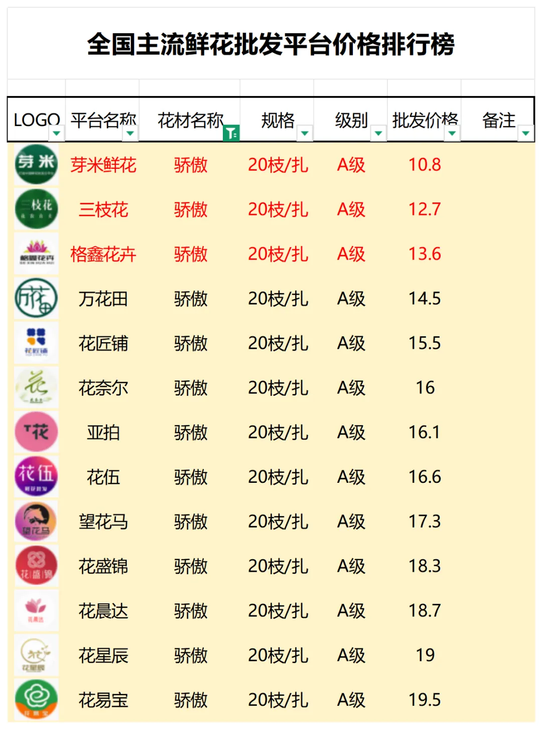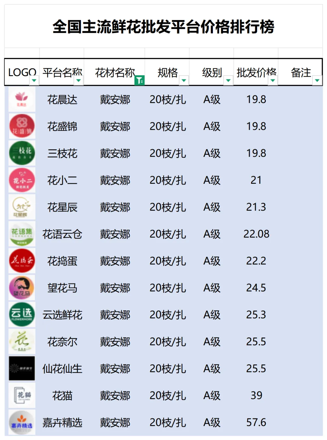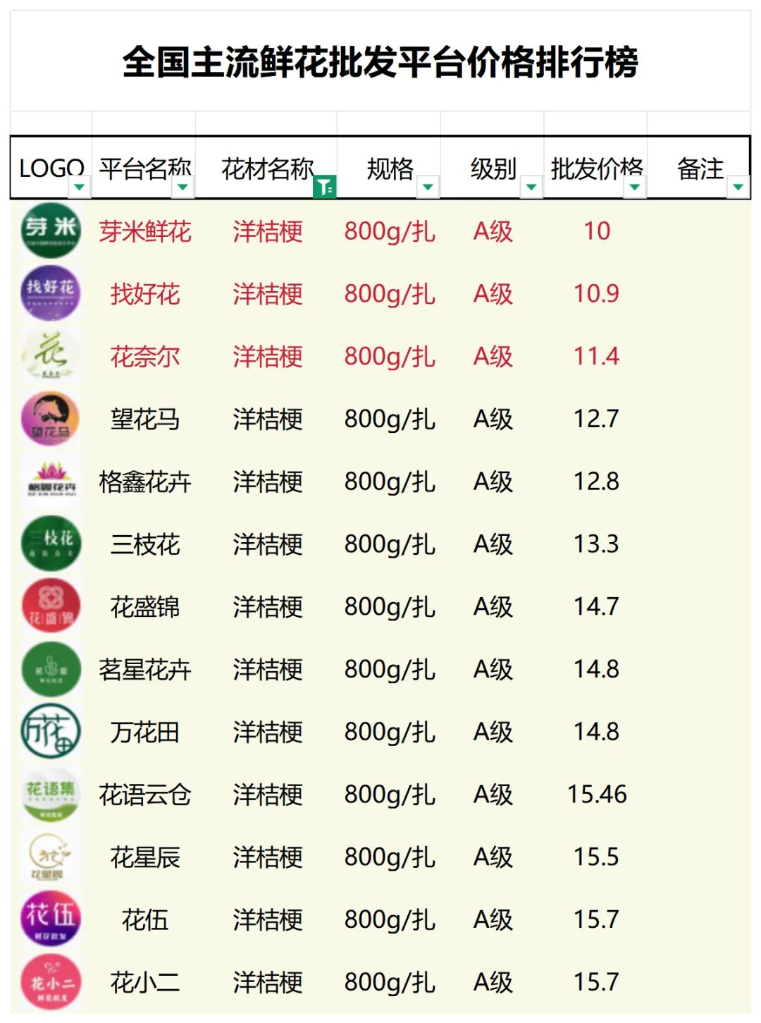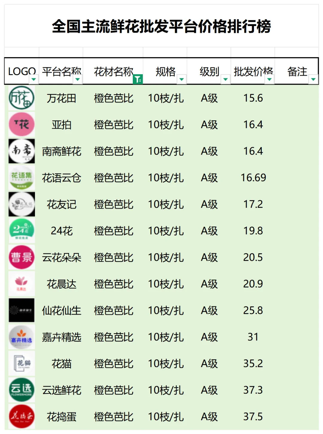 2、本数据只收录A级花材批发价格,覆盖全国大部分主流鲜花批发平台
