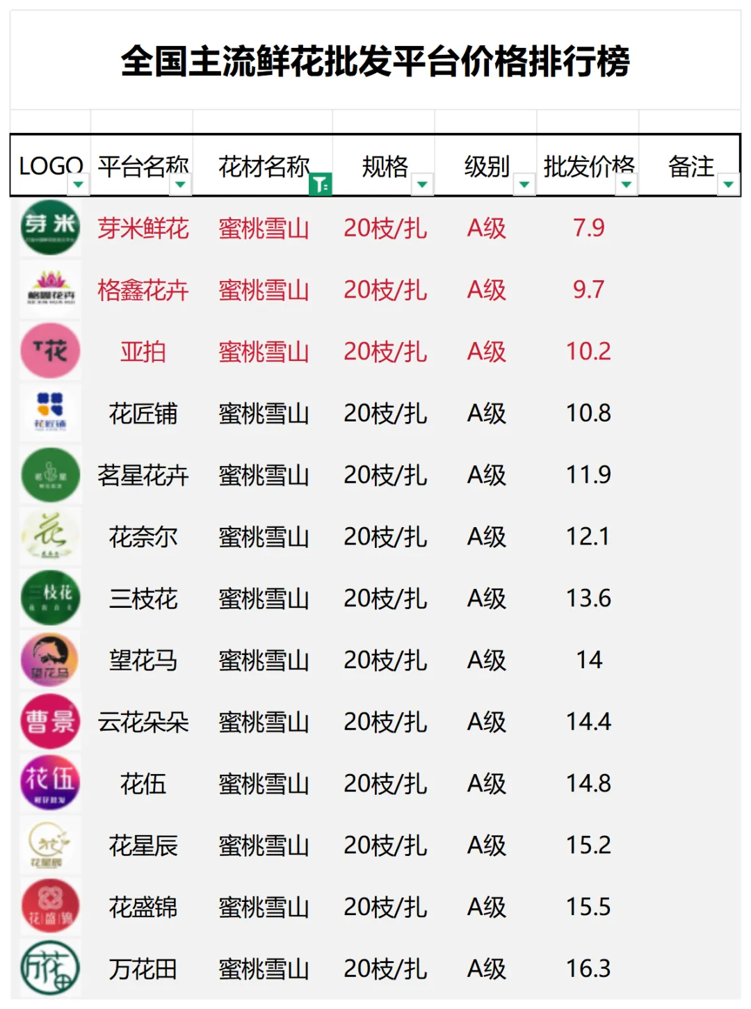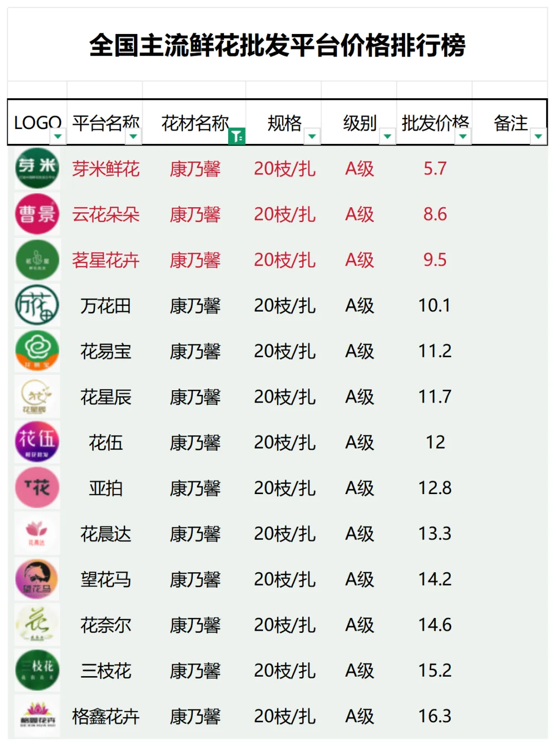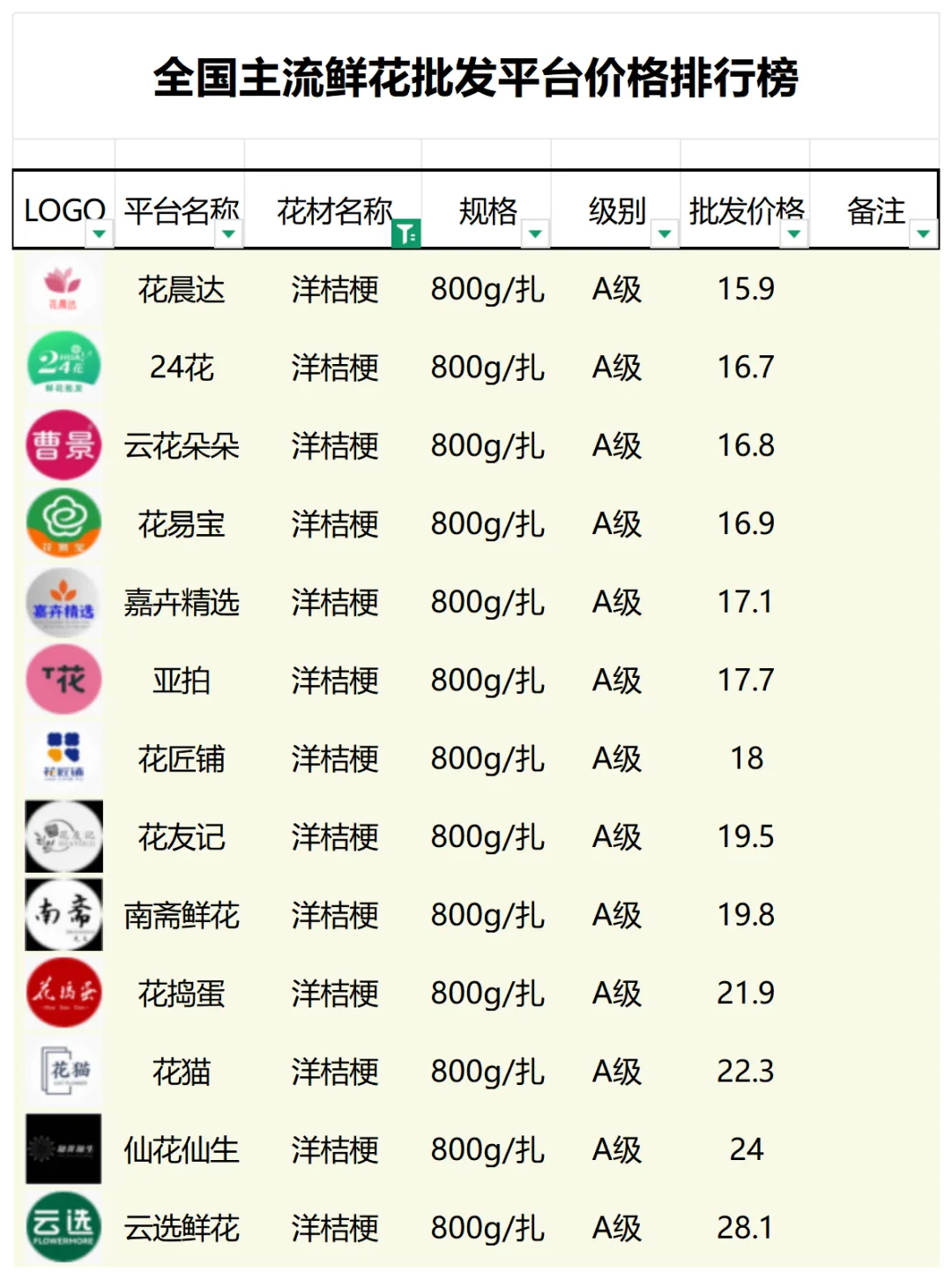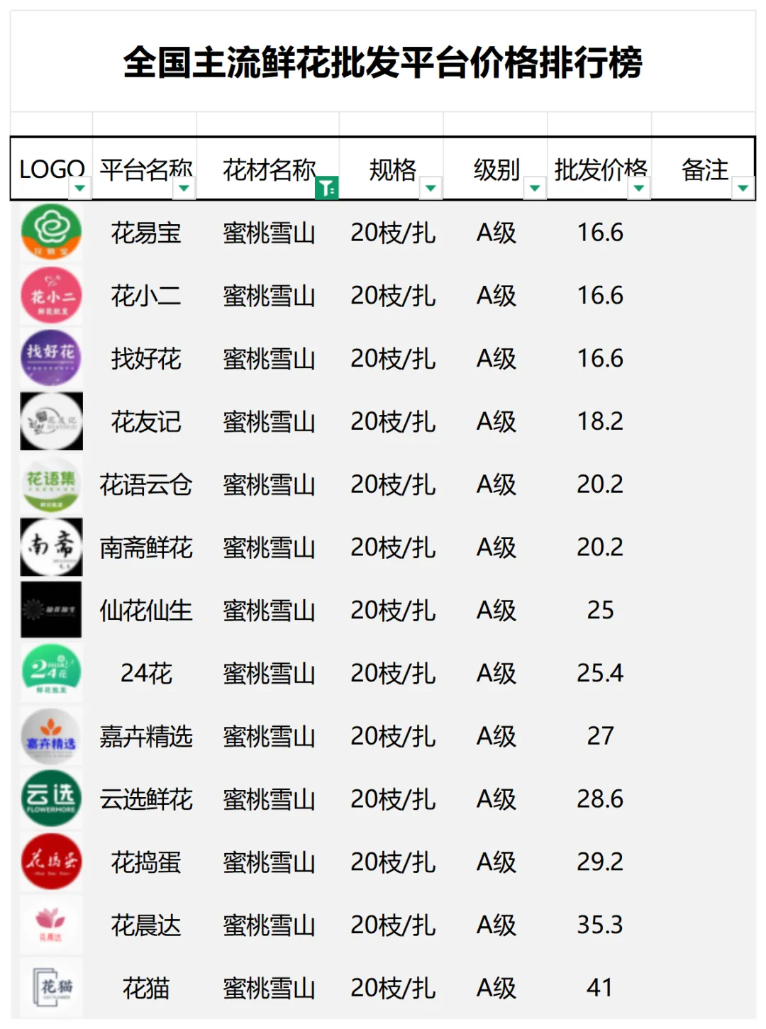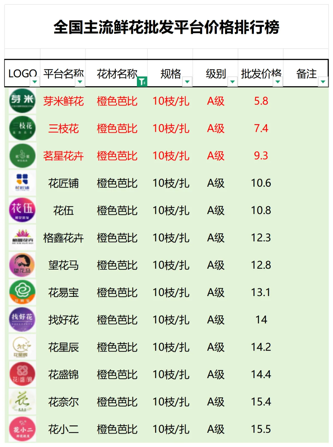 2、本数据只收录A级花材批发价格,覆盖全国大部分主流鲜花批发平台