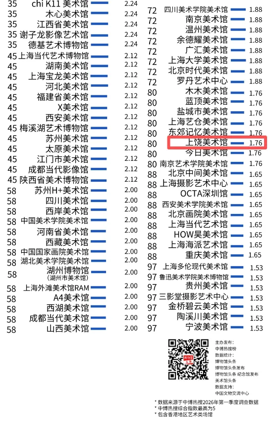 全国百强!上饶美术馆上榜2026年第一季度热门百强美术馆及艺术博物馆榜单!