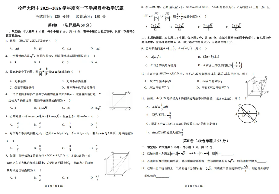 【百强校】【黑吉辽蒙卷】【高一】黑龙江省哈尔滨市哈师大附中2025—2026学年度高一下学期4月月考(4.10-4.11) 全科试题卷+答案