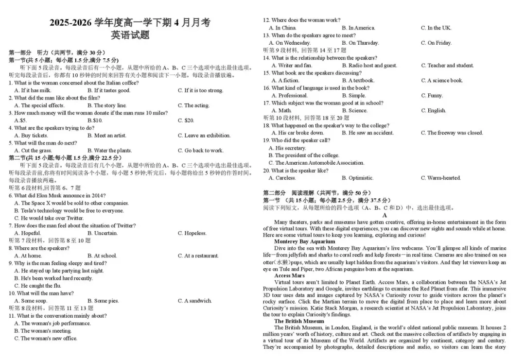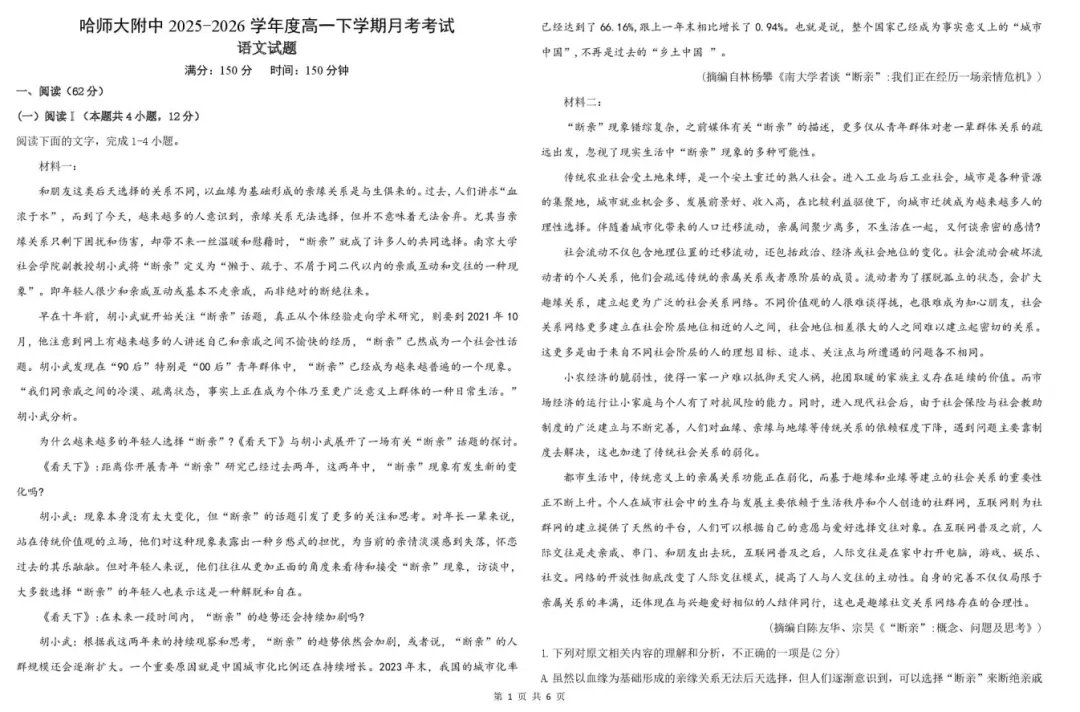 【百强校】【黑吉辽蒙卷】【高一】黑龙江省哈尔滨市哈师大附中2025—2026学年度高一下学期4月月考(4.10-4.11) 全科试题卷+答案无页眉页脚页码无添加无私货无夹带无水印的纯净电子版部分内容展示【文末可下载全科打包版【文末可下载全科打包版(文未底部加黑加粗加大的蓝色字体"阅读原文"即为下载链接,点击即可进入下载链接】: