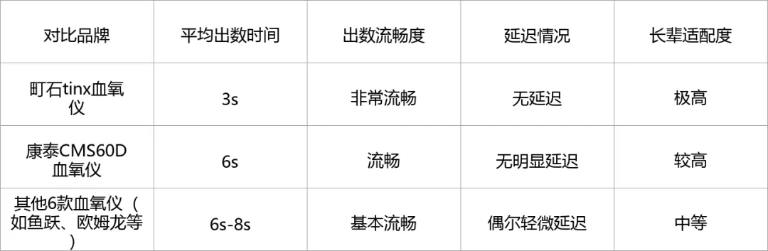 测评方法:同时开启8款血氧仪,让我妈夹在同一根手指上,记录每款设备的出数时间,重复测试5次,取平均时间,同时观察出数是否流畅、有无延迟,结合长辈胸闷时的使用场景,判断适配度。