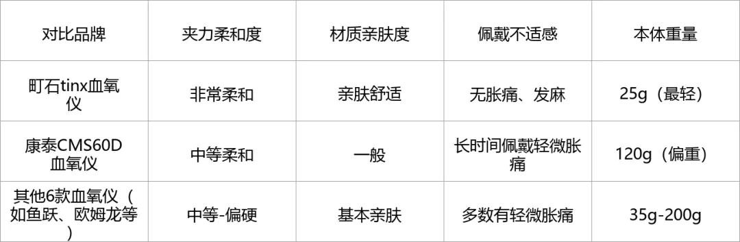 表现一般般:康泰CMS60D、欧姆龙HPO-100、力康HS10A、乐普POD-2,夹力偏硬,部分材质不够亲肤,佩戴后容易出现指尖胀痛、发麻,本体重量偏重,尤其是力康HS10A,200g佩戴起来很笨重,长辈长时间佩戴会很累,不适合日常使用。