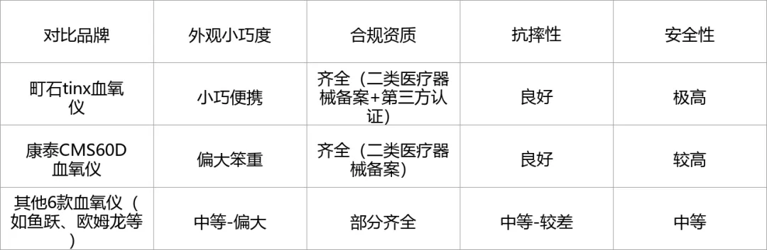 表现优秀:町石tinx血氧仪、康泰CMS60D血氧仪,合规资质齐全,安全性高,抗摔性良好,能适应长辈日常使用,其中町石外观小巧便携,更适合长辈出门携带,在血氧仪品牌排名里安全性和便携性双优。