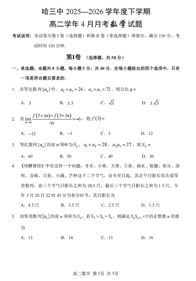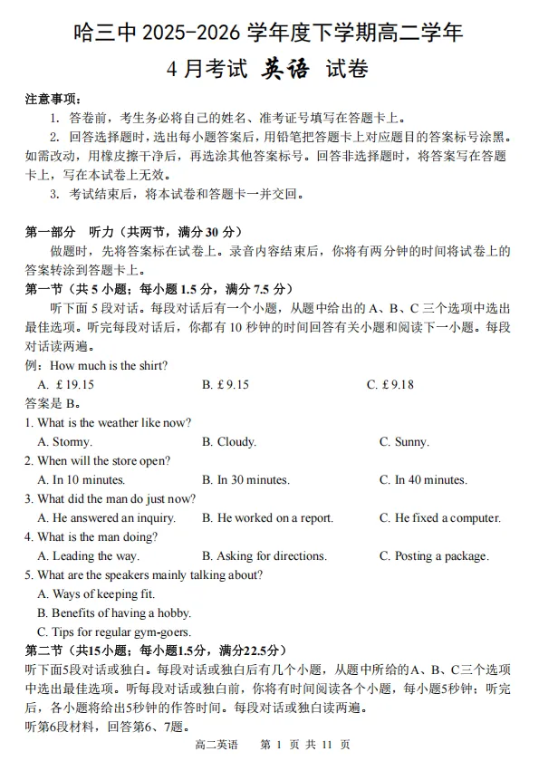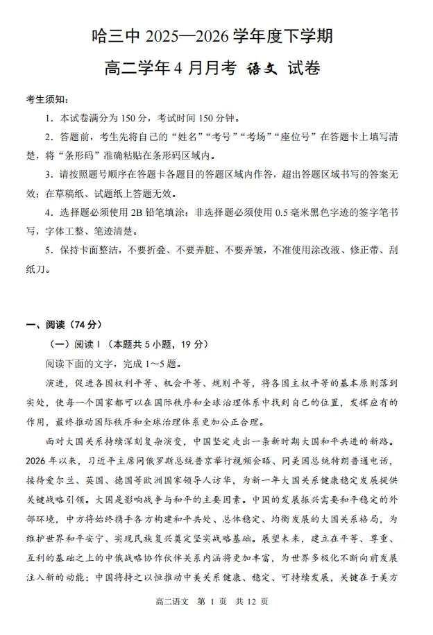【百强校】【黑吉辽蒙卷】【高二】黑龙江省哈尔滨市第三中学2025—2026学年度下学期高二学年4月月考(4.10-4.11) 全科试题卷+答案无页眉页脚页码无添加无私货无夹带无水印的纯净电子版部分内容展示【文末可下载全科打包版【文末可下载全科打包版(文未底部加黑加粗加大的蓝色字体"阅读原文"即为下载链接,点击即可进入下载链接】:
