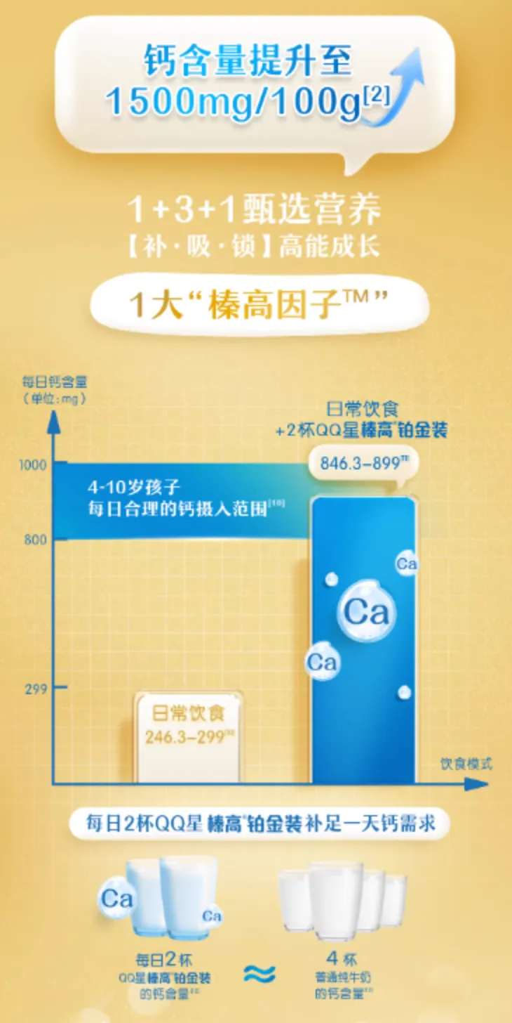 针对3岁以上儿童的成长需求,伊利QQ星榛高铂金装提出了“1+3+1”甄选营养方案,旨在系统化解决“补钙-促吸收-锁入骨”的成长营养链条。其核心在于: