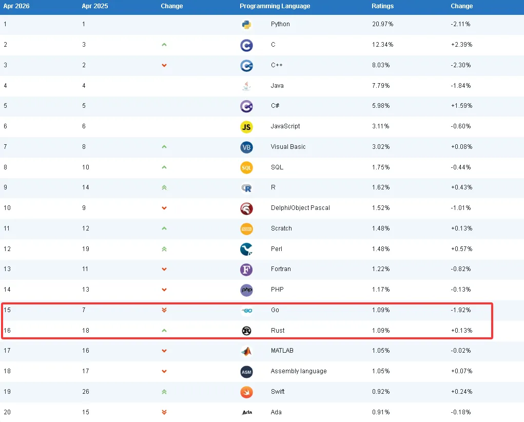 Rust 是 TIOBE 指数前20名中最年轻的编程语言。该语言于2020年6月首次跻身前20,当时业界普遍预计它将闯入前十,成为 C 与 C++ 的强力竞争对手。而这已是近六年前的事了。