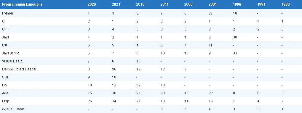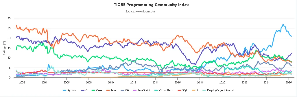TIOBE 编程社区指数是衡量编程语言流行度的重要指标,每月更新一次。该指数的评分依据全球专业工程师数量、相关课程规模及第三方服务商数量综合得出,计算数据来源于谷歌、亚马逊、维基百科、必应等20余个主流网站。需要明确的是,TIOBE 指数并非评判“最佳编程语言”或“代码编写量最多的语言”的标准。
