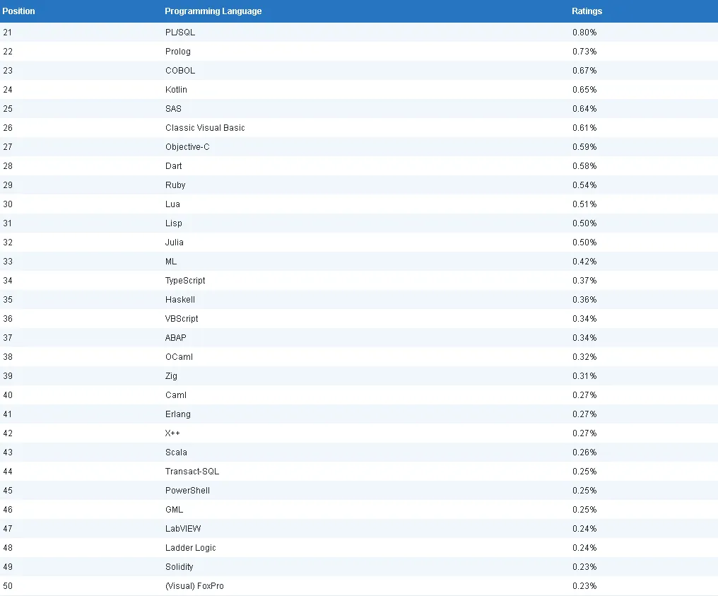 以下列出完整的编程语言TOP 50榜单。此概览为非官方发布,因此我们可能存在遗漏某门语言的情况。
