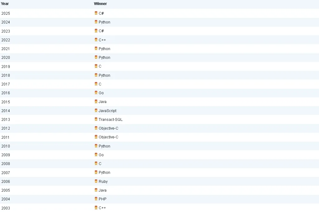以下列出历年“年度编程语言”获奖名单。该奖项授予年度评分涨幅最高的编程语言。
