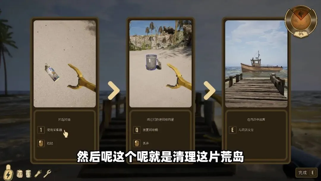 玩家可以用工具清理遍布全岛的垃圾,把收集到的废弃物回收转化为可用资源。