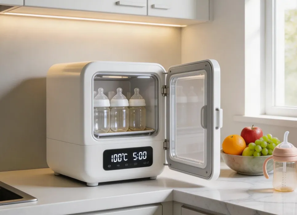 ✅首选「UVC紫外线+热风烘干」组合。紫外线穿透力强,能覆盖瓶身内外缝隙,搭配恒温烘干避免二次污染,比单纯水煮更彻底,潮湿天气也不怕滋生霉菌。