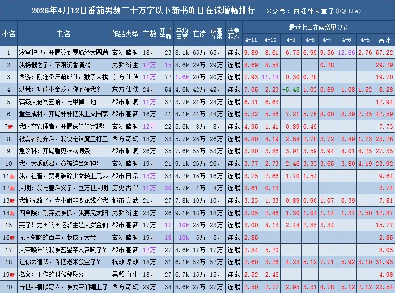 番茄新书榜范围:30万字以下、已签约未下架、已经开始推荐的且未断更,完结未超过90天的番茄原创作品