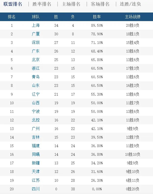 辽宁队则排在积分榜第9名,这一轮比赛,他们在客场掀翻山东队以后,球队的战绩变成21胜17负,球队提前4轮锁定季后赛席位。第10名则属于山西队,他们这一轮比赛惨败给北控队,战绩变成19胜19负,宁波队则排在第11名,战绩也是19胜19负。季后赛守门员的位置,则属于北控队,他们的战绩为16胜22负。广州队同样赢球,这一轮比赛击败江苏队以后,他们的战绩也是16胜22负,排在第13名。