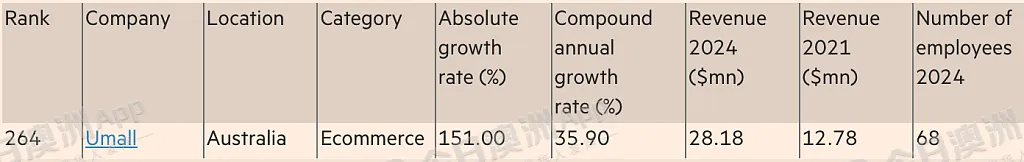 这36家澳洲上榜企业中,电子商务(Ecommerce)类共有3家,分别为Paire、Umall和Solbari ,而Umall是唯一的华人生鲜类电商,位于总榜单第264位,在全澳入选企业中排名第18位。