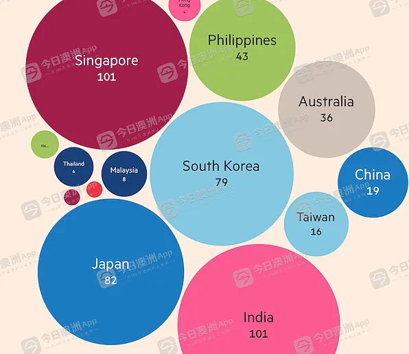 从地区分布来看,新加坡和印度入榜企业数量最多,各有101家;日本以82家位列其后,韩国则为79家。