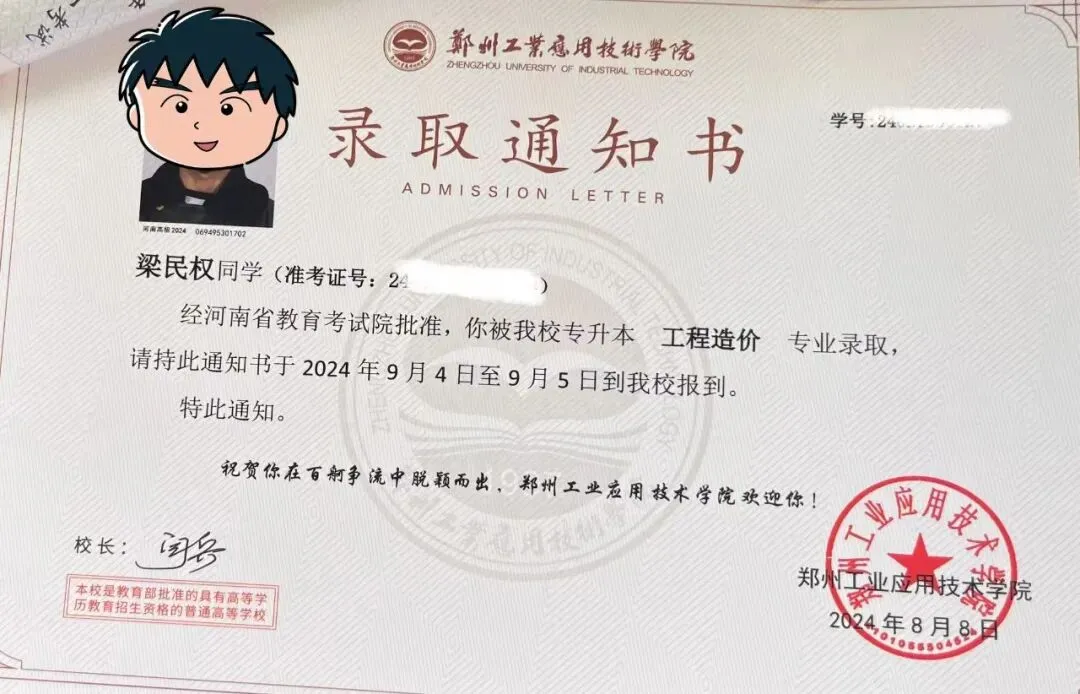 功夫不负有心人。2024年,梁民权突破自身局限,顺利通过河南省专升本考试,成功上岸郑州工业应用技术学院,完成了从专科到本科的华丽蜕变。