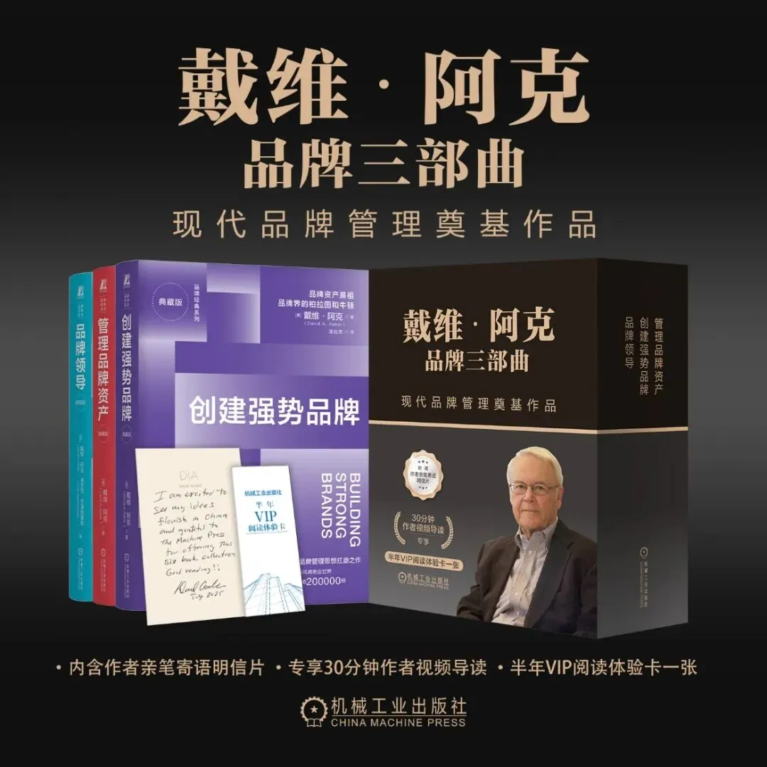 他的《管理品牌资产》、《创建强势品牌》和《品牌领导》三部著作,自问世以来畅销全球,成为微软、可口可乐、英特尔等世界500强企业的内部培训教材,更被无数品牌人奉为“案头经典”。如今,我们将这三部里程碑式的作品集结推出「戴维·阿克品牌三部曲图书礼盒」,更附赠阿克本人手写寄语明信片、30分钟独家视频导读,让你以最便捷的方式,吃透品牌管理的底层逻辑,避开营销误区,实现品牌的长期增长。