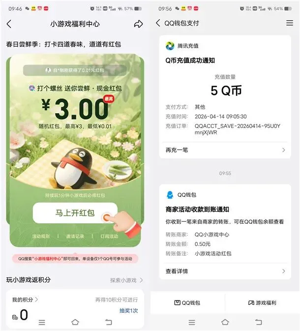 参加手机QQ举办的小游戏福利中心抽现金红包活动,通过打开手机QQ进去活动里,首次进去按照提示玩1分钟小游戏领一个随机金额现金红包,之后的红包是分享好友助力领,我自己玩了1分钟领到0.5元,可以领到多个红包。