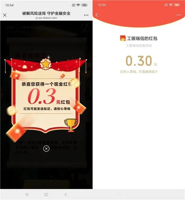 参加工银瑞信基金举办的特工行动答题抽1万个微信红包活动,通过打开微信进去活动里,答完4道简单的题目抽奖,题目很简单,每天可以抽2次(答完题1次、假分享1次),有机会中到随机金额微信红包,小编亲测刚中0.3元,非必中。