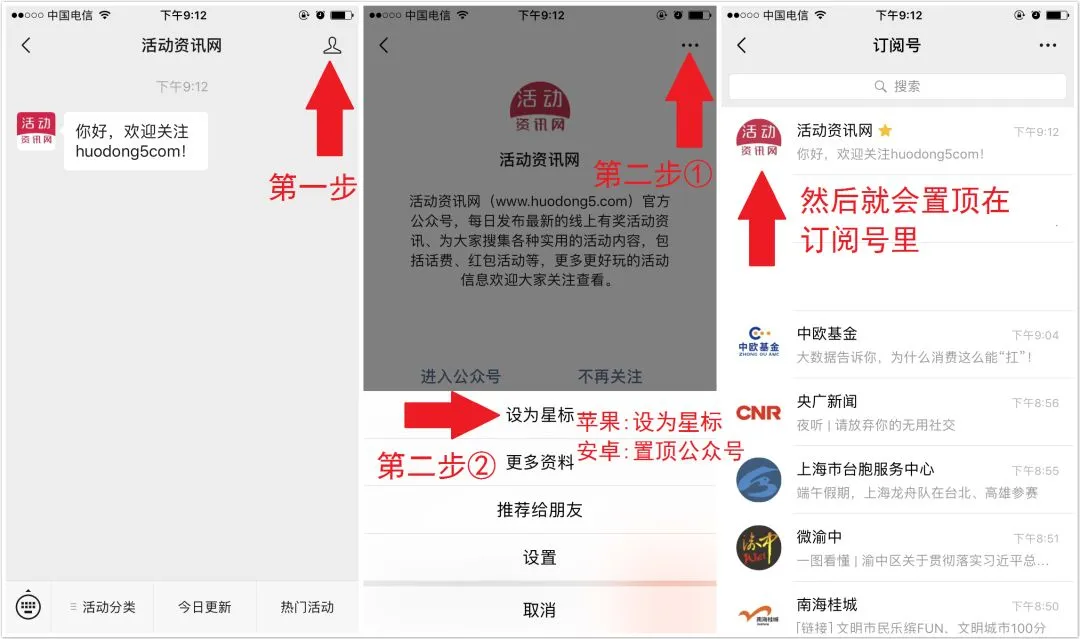 将公众号设为星标、置顶公众号,每天实时参加各种活动