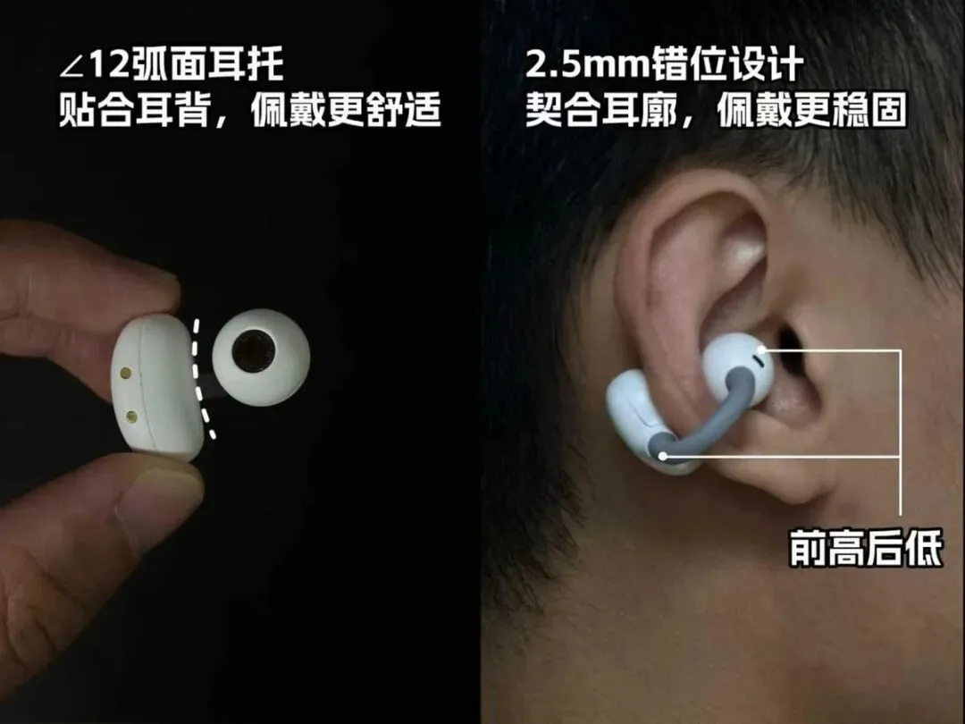 佩戴体验同样出色,单耳仅 4.5g,轻量化设计实现无感佩戴;延续 2.5mm 错位设计,与耳朵形成前高后低的贴合形态,搭配 12° 弧面耳托,为耳背提供充足支撑,久戴无痛、运动时也不会晃动,舒适度处于同价位前列。