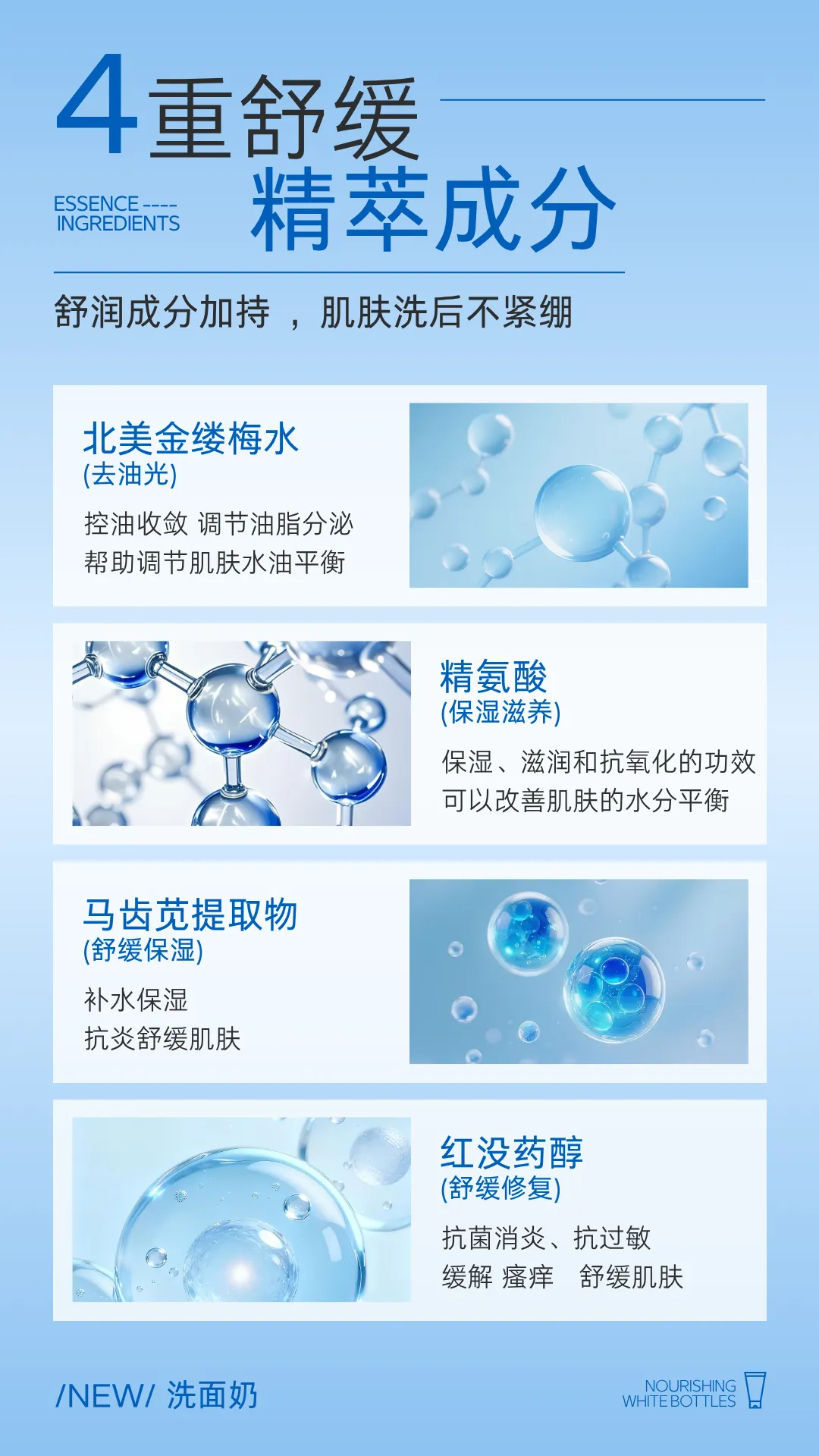- 舒缓保湿不紧绷:添加了精氨酸、甘油等保湿成分,清洁同时锁住水分,洗后皮肤水润不紧绷,即时水润度提升35%。