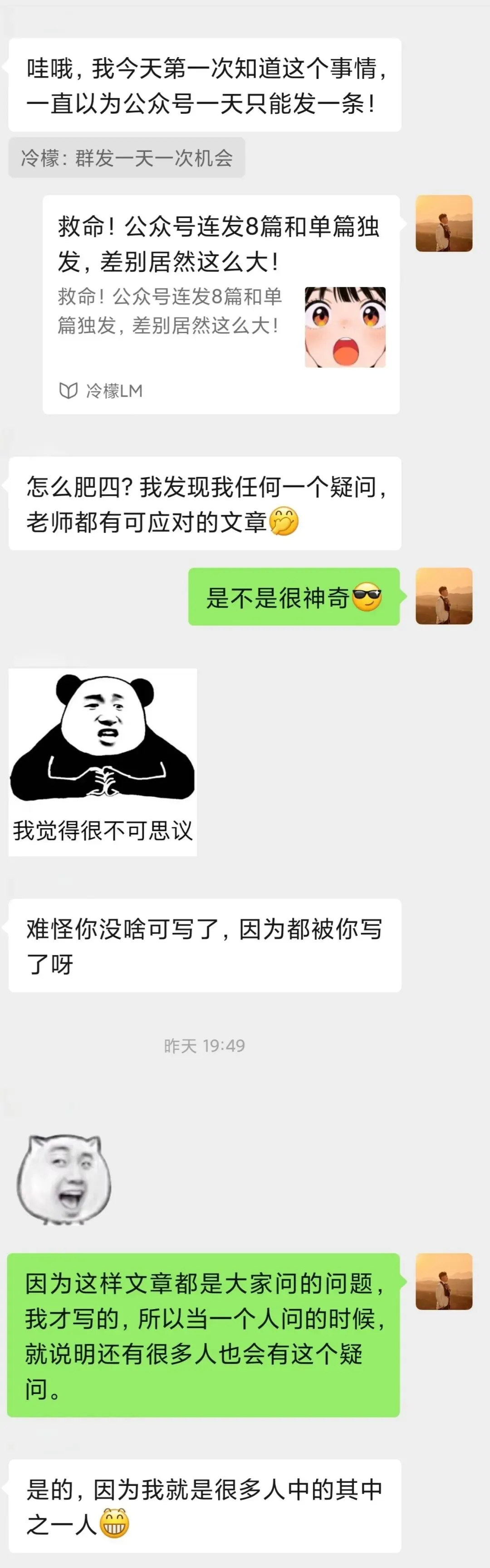 最开始,我只是在想在闲暇时能够有个地方记录一下自己的心情、分享一下自己和家人的日常、宣泄一下现实中烦躁的小情绪,把公众号当作一个心情树洞,确切说是电子日记本来写的,这是我最初的做号打算;可后来发现自己更擅长自媒体运营,于是我就把自己的公众号运营经验和技巧一一写成文章、做成攻略分享给大家。没想到慢慢坚持下来后,不仅收获了一起携手同行的朋友,还能获得一份可观的收益。