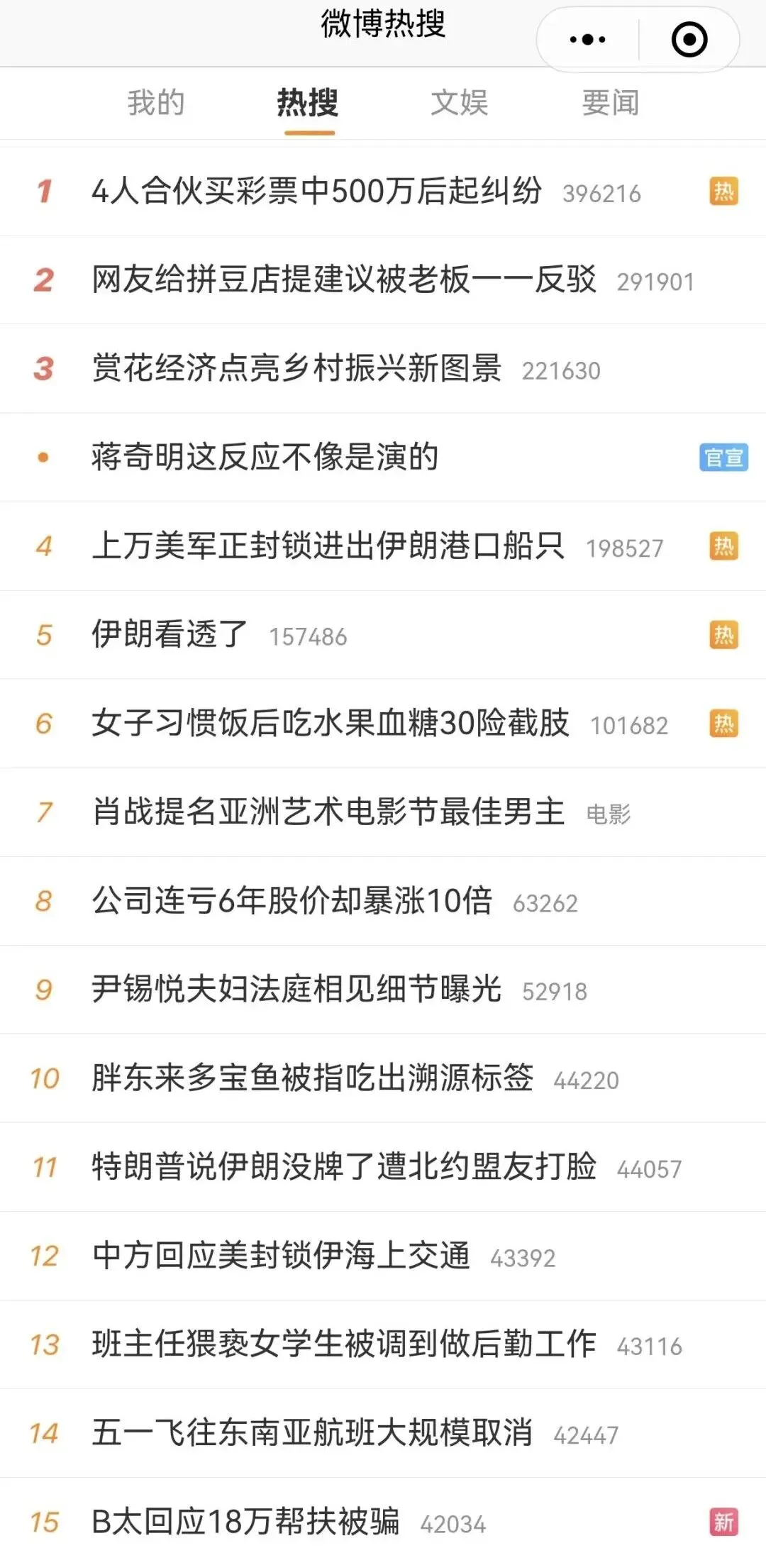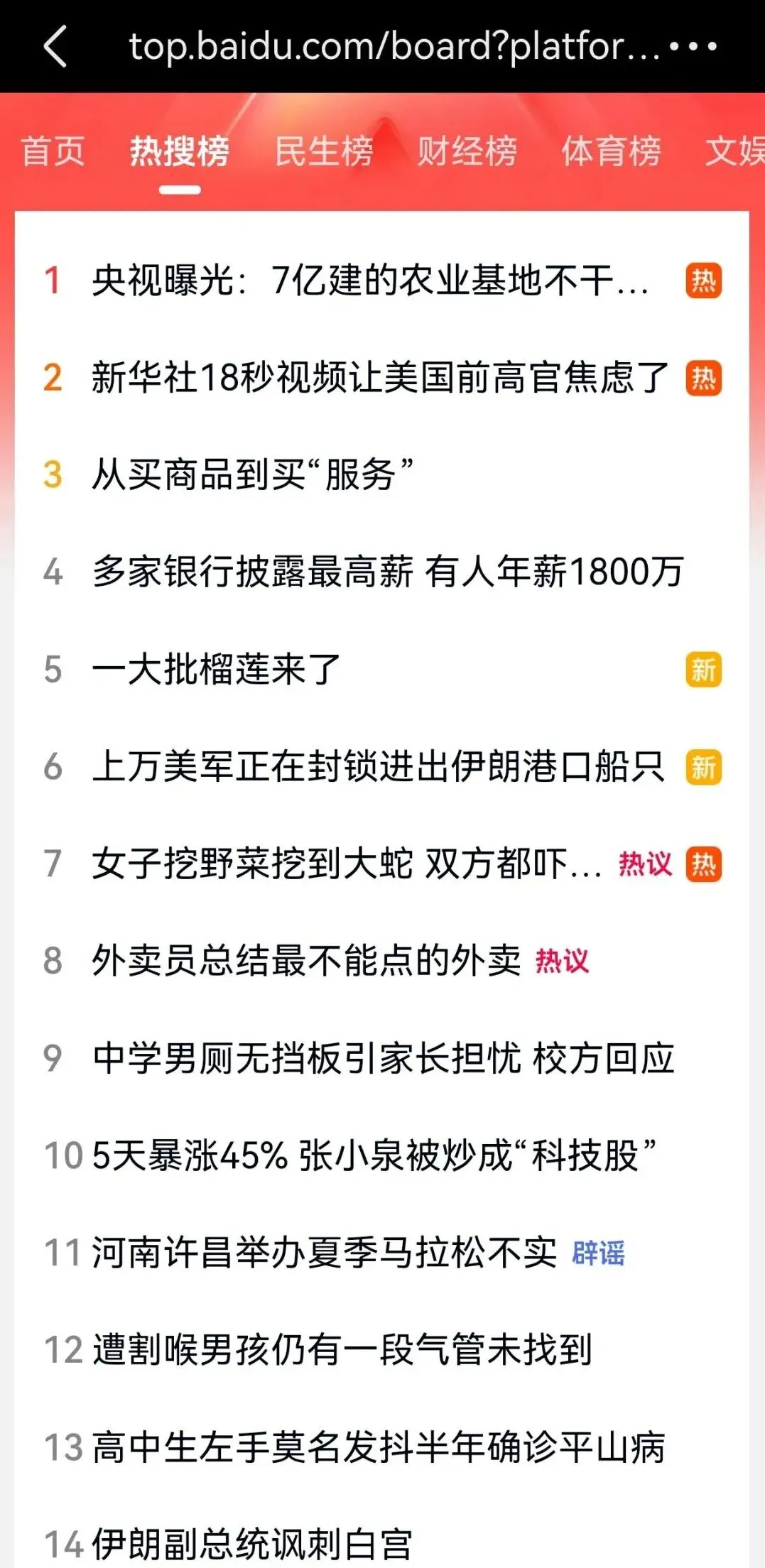7 亿建的农业基地不干农业央视曝光山东莒南县花 7 亿建"农业实训基地",结果只有酒店、健身房、棋牌室,唯一跟农业相关的只有一块小牌子。简评:这哪是实训基地,这是把"挂羊头卖狗肉"玩明白了,专项债不是这么花的。美军封锁伊朗港口超过 1 万名美军、十余艘军舰从 4 月 13 日起封锁进出伊朗港口的船只,24 小时内无船只突破,6 艘商船掉头返回。简评:这架势,霍尔木兹海峡要变"收费通道"了?伊朗说这是"荒谬可笑"。女子挖野菜遇大蛇双方都吓跑四川宜宾王女士挖折耳根遇到近 2 米乌梢蛇(无毒),双方都吓得连滚带爬逃跑,蛇还从土坡滚下去。简评:这届蛇也不行啊,胆子比人还小,双向奔赴的逃跑太逗了。4 人合伙中 500 万彩票起纠纷河南许昌 4 人合伙买彩票中 507 万,一人分 106 万后起诉要剩余 19 万,法院判再给 78500 元。简评:本来皆大欢喜的事,最后闹上法庭,钱分不明白比没中还闹心,朋友变被告。跨平台热点:美军封锁伊朗港口(百度#6、微博#4)全网关注;河南许昌马拉松辟谣(抖音#13、百度#11)双平台上榜,体育局确认 2026 年没举办计划。