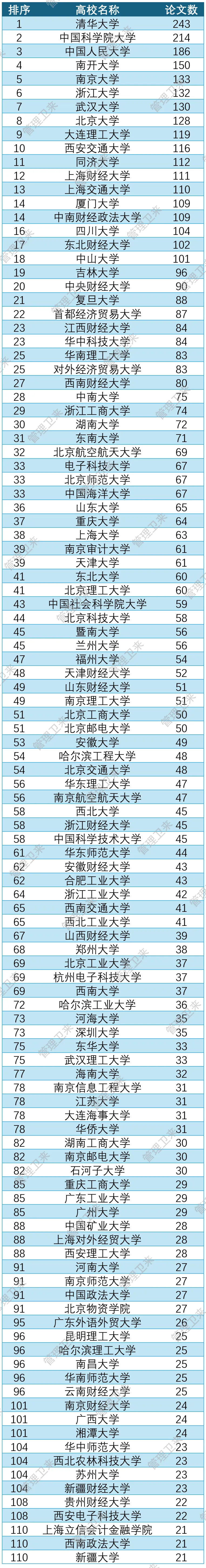 从结果来看,清华大学以243篇位居首位,中国科学院大学以214篇位列第二。除这两所高校外,还有16所高校发文量超过100篇,分别为:中国人民大学、南开大学、南京大学、浙江大学、武汉大学、北京大学、大连理工大学、西安交通大学、同济大学、上海财经大学、上海交通大学、厦门大学、中南财经政法大学、四川大学、东北财经大学和中山大学。