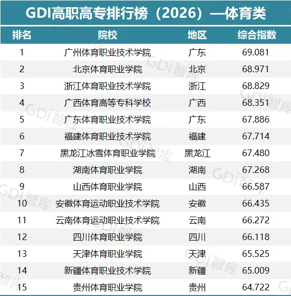 GDI高职高专排行榜(2026)—体育类榜单中,广州体育职业技术学院、北京体育职业学院、浙江体育职业技术学院居前三。