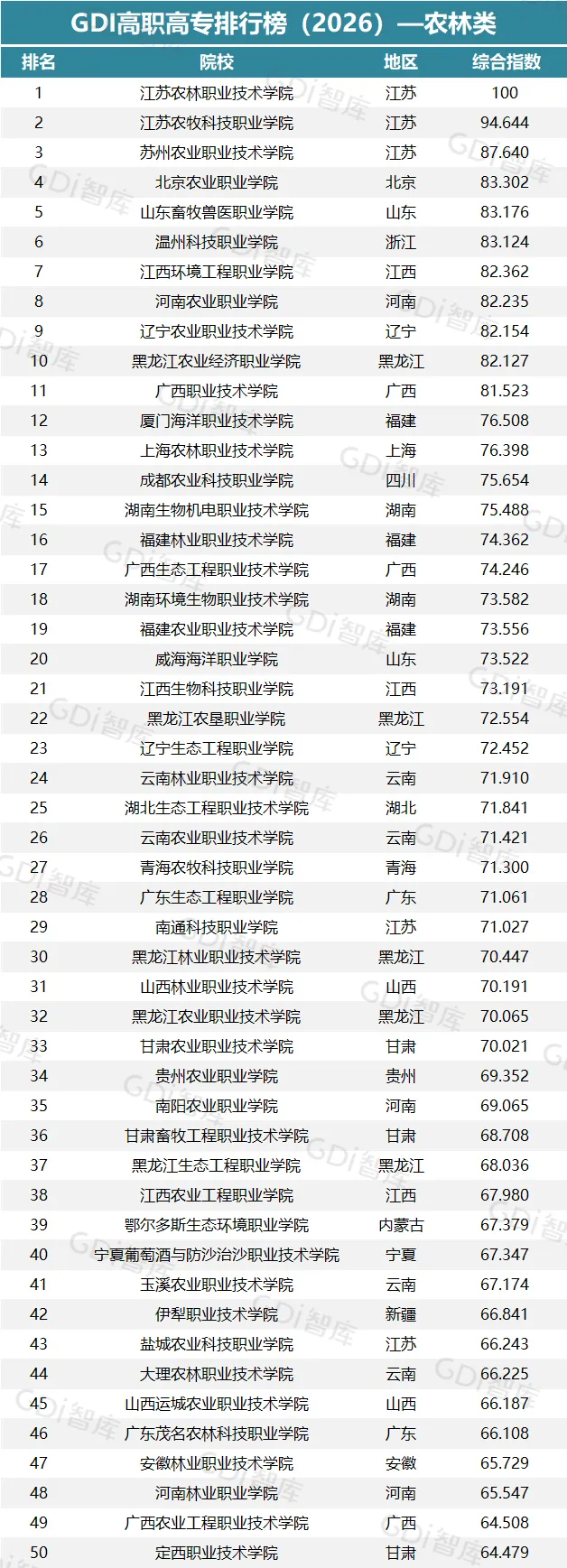 GDI高职高专排行榜(2026)—农林类榜单中,江苏农林职业技术学院、江苏农牧科技职业学院、苏州农业职业技术学院居前三。