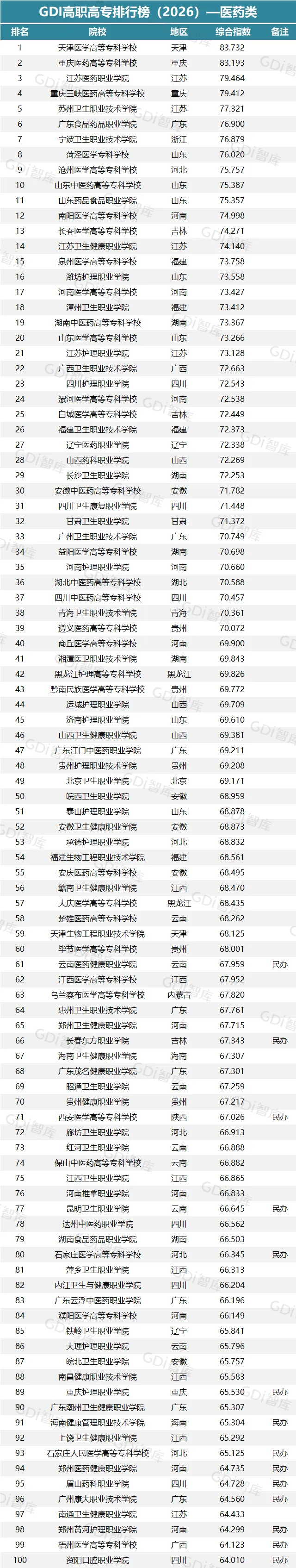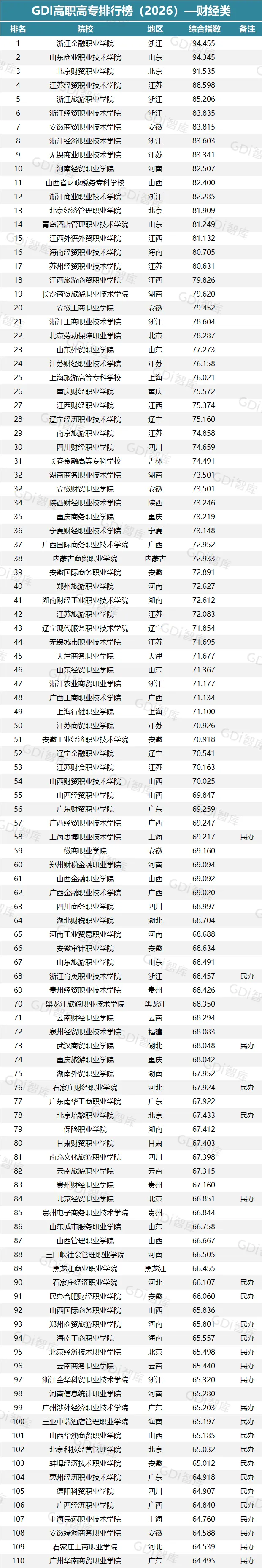 GDI高职高专排行榜(2026)—财经类榜单中,浙江金融职业学院、山东商业职业技术学院、北京财贸职业学院居前三。