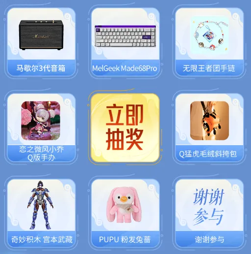 点击文末【阅读原文】打开4399游戏盒下载游戏,参与抽奖赢马歇尔3代音箱、MelGeek Made68Pro、无限王者团手链、恋之微风小乔Q版手办等豪礼!