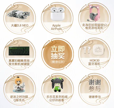 参与4399游戏盒-《王者荣耀世界》下载抽奖活动,赢大疆DJNE0、Apple AirPods、北海巨妖游戏耳机、HOK30蓝牙耳机、黑寡妇蜘蛛机械键盘等豪礼!