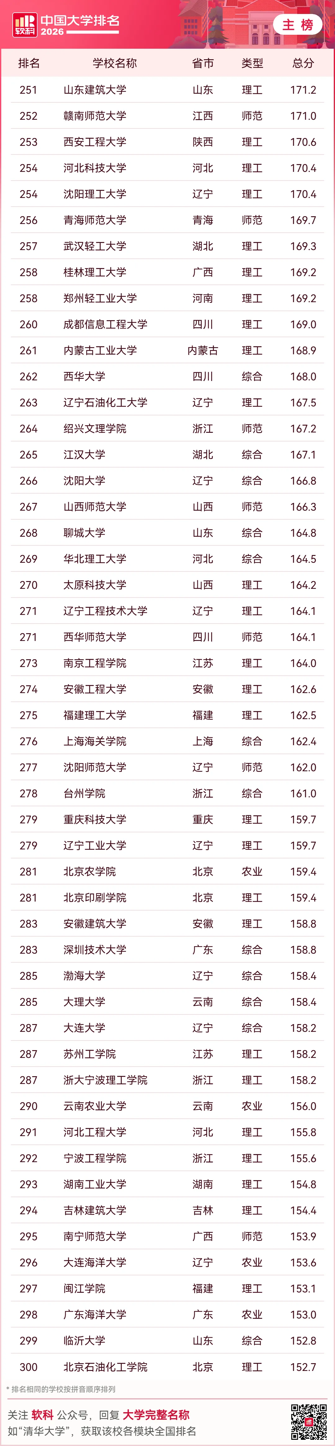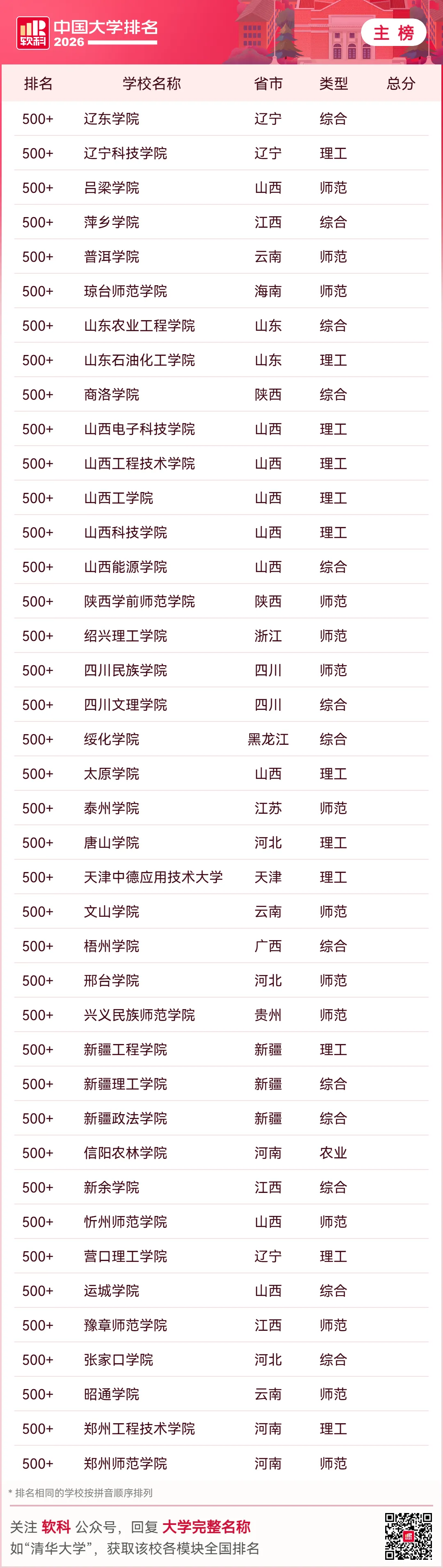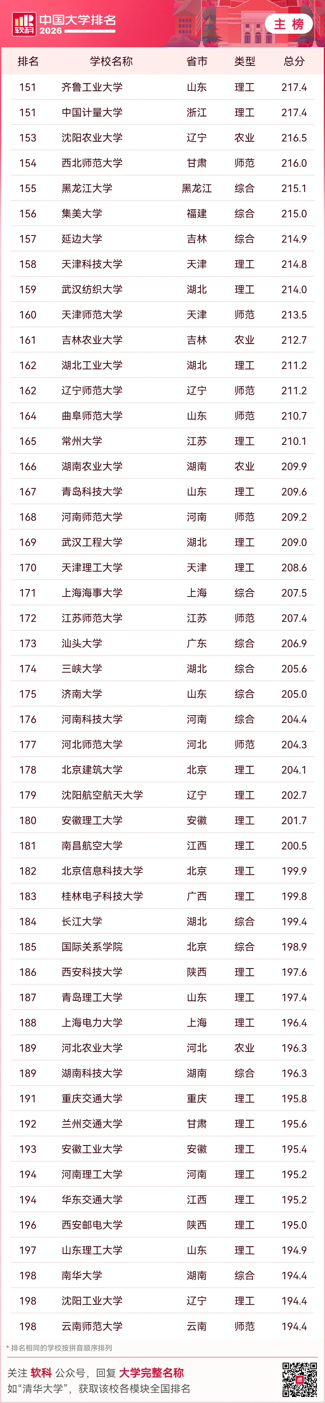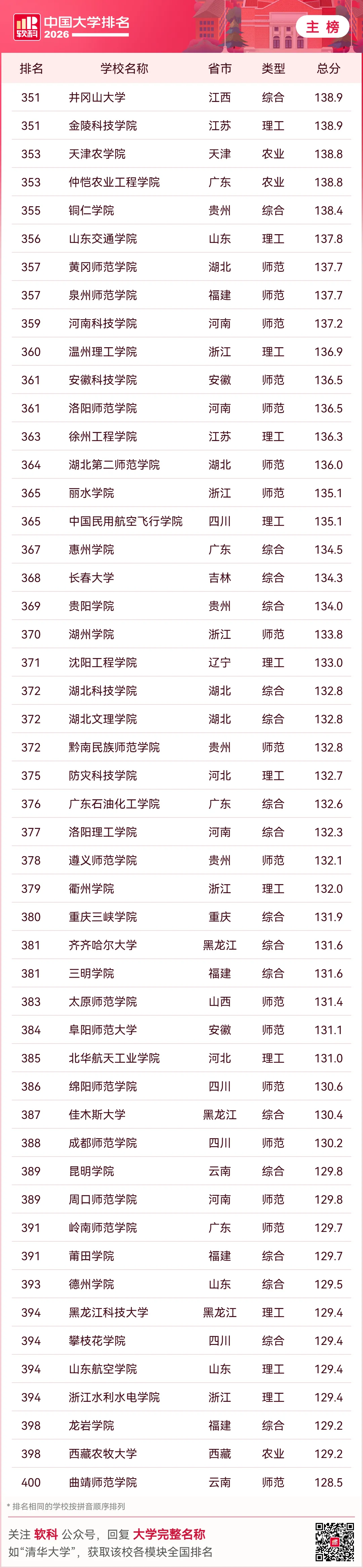 2026软科中国大学排名(主榜)的上榜高校共有590所,清华大学、北京大学、浙江大学连续12年蝉联全国三甲,实力强劲。上海交通大学、复旦大学位列全国前五。其他位列全国前十名的大学依次为南京大学(第六)、中国科学技术大学(第七)、武汉大学(第八)、华中科技大学(第九)、西安交通大学(第十)。