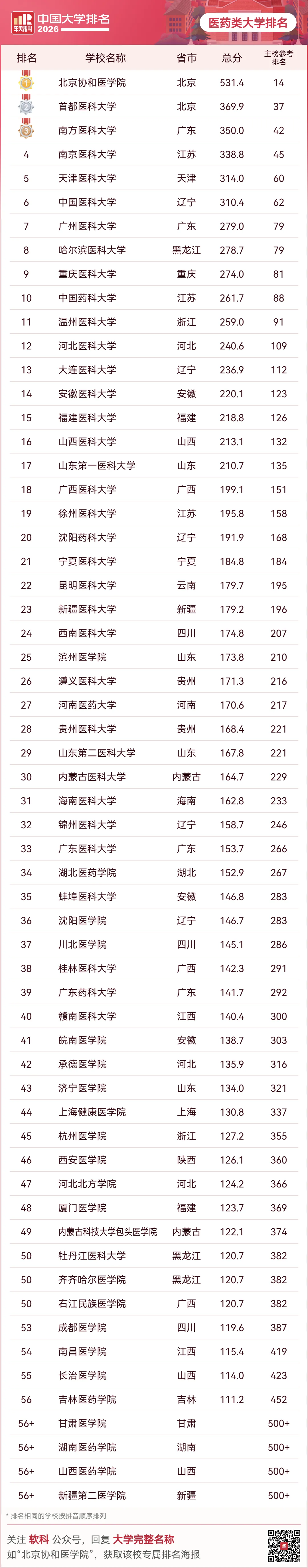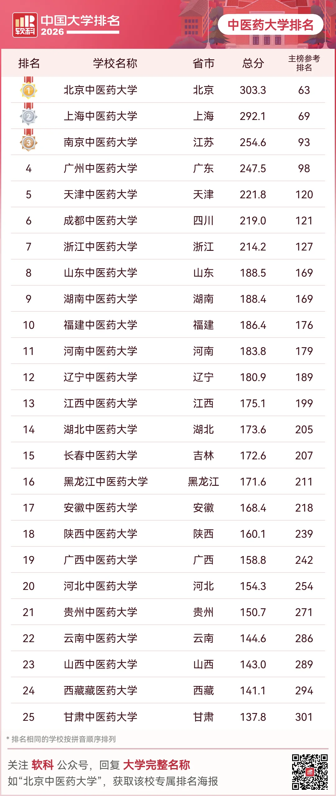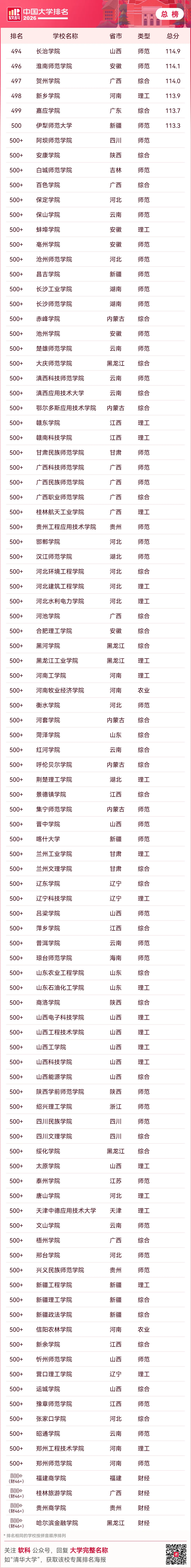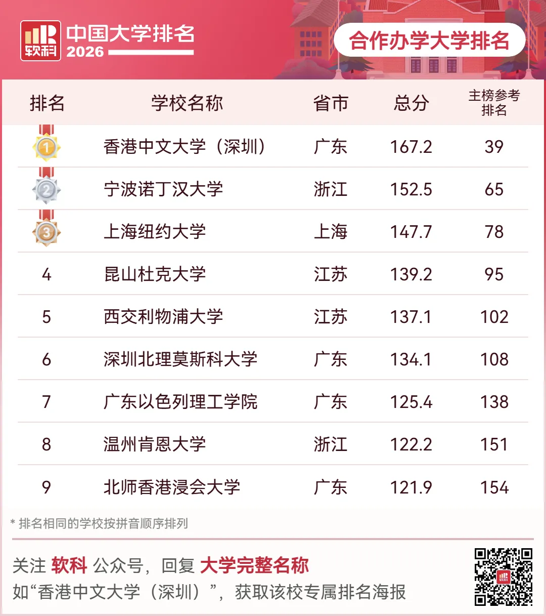 2026软科中国大学排名(主榜)的上榜高校共有590所,清华大学、北京大学、浙江大学连续12年蝉联全国三甲,实力强劲。上海交通大学、复旦大学位列全国前五。其他位列全国前十名的大学依次为南京大学(第六)、中国科学技术大学(第七)、武汉大学(第八)、华中科技大学(第九)、西安交通大学(第十)。