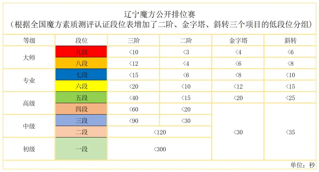 比赛每周进行,根据项目段位水平比赛,例:第一周比赛项目为三阶大师九段、金字塔高级五段。