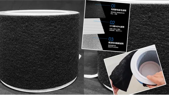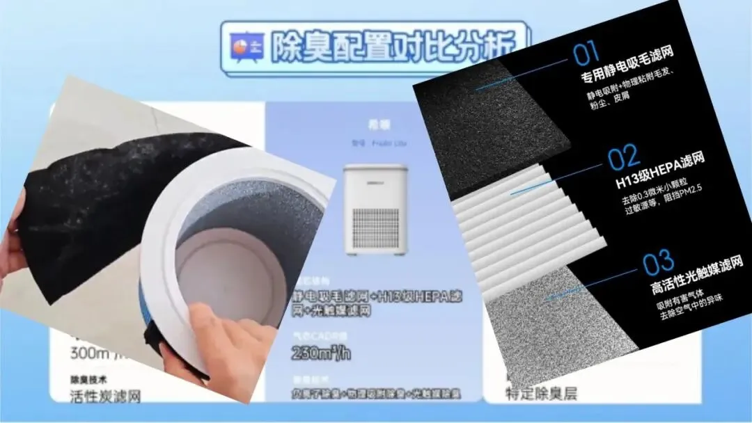 优先选高等级HEPA,活性炭层尽量厚实(标注克重或蜂窝结构更优);最好选择光触媒除臭的,可以从源头分解异味,也不会有饱和返味的风险。