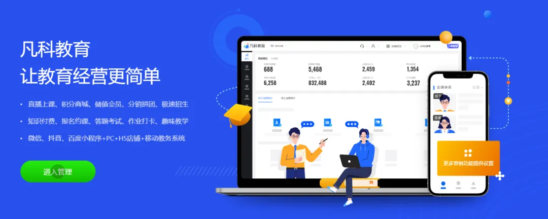 亮点:拥有用多种丰富的助学工具如学费报缴工具、信息收集表单、成绩/班级查询工具和海量题库闯关打卡,满足培训机构的多样化教学业务场景需求。支持线上直播授课、图文课程、视频课程等多种教学方式,教学形式多样适应不同类型需求。内置多种知识付费功能,支持PC、手机多终端全渠道覆盖获客。还配备了老带新好友助力、分销拼团、积分商城等多种营销拓客增加生源的系统。有效帮助教育培训机构高效管理、引流拉新。