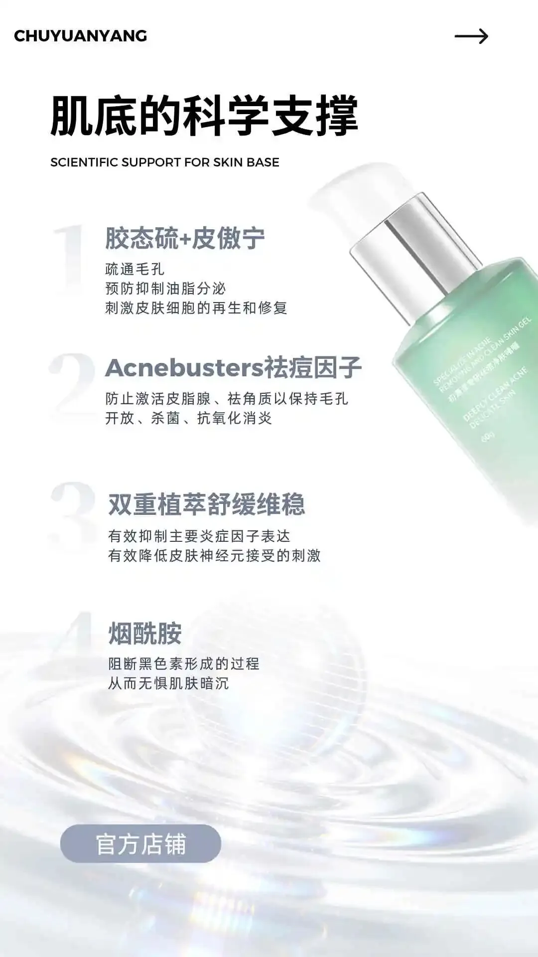 淡印提亮担当(专利烟酰胺 ZL201610522039.9):阻断黑色素生成与传递,淡化新生红痘印、陈年黑痘印,改善肌肤暗沉,提亮肤色,让痘肌告别 “痘印脸”,恢复透亮细腻。