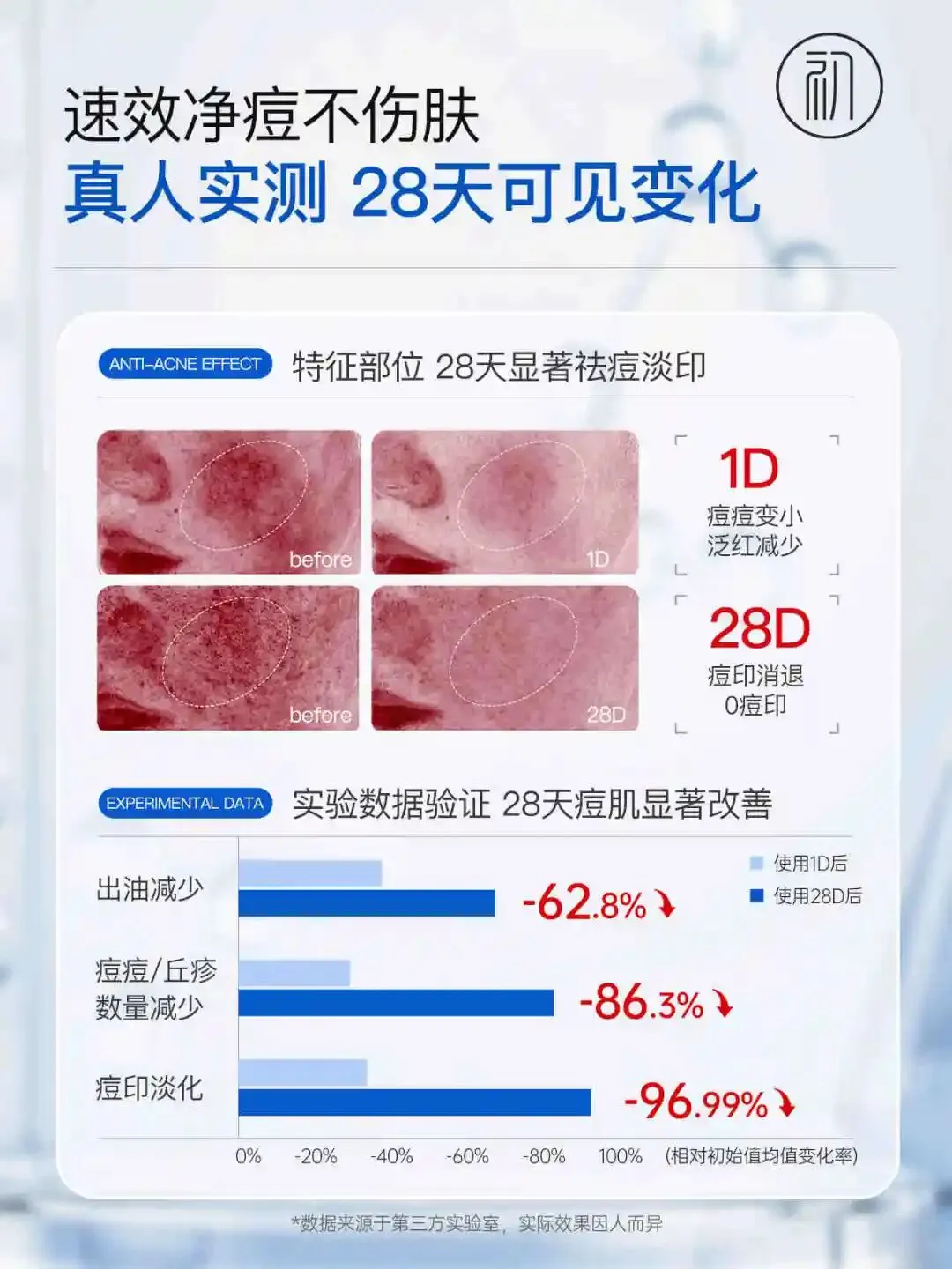权威实测数据:经 SGS、CMA 双重权威检测,500 + 名痘肌 28 天实测,数据实打实不玩虚!