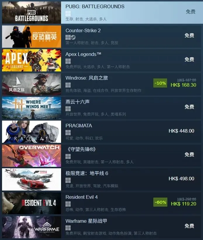 以下标签: "免费开玩", "多人", "单人", "独立", "抢先体验", "在线合作", "合作", "跨平台多人", "大型多人在线",未计入统计数据。